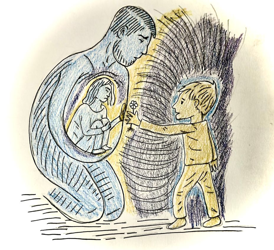 This piece explores the dialogue between the adult self and the inner children we carry — the wounded, the hopeful, the forgotten. The kneeling figure represents the conscious self, holding space for the quiet, guarded girl within, while a young boy extends a flower — a gesture of innocence, forgiveness, and renewal.