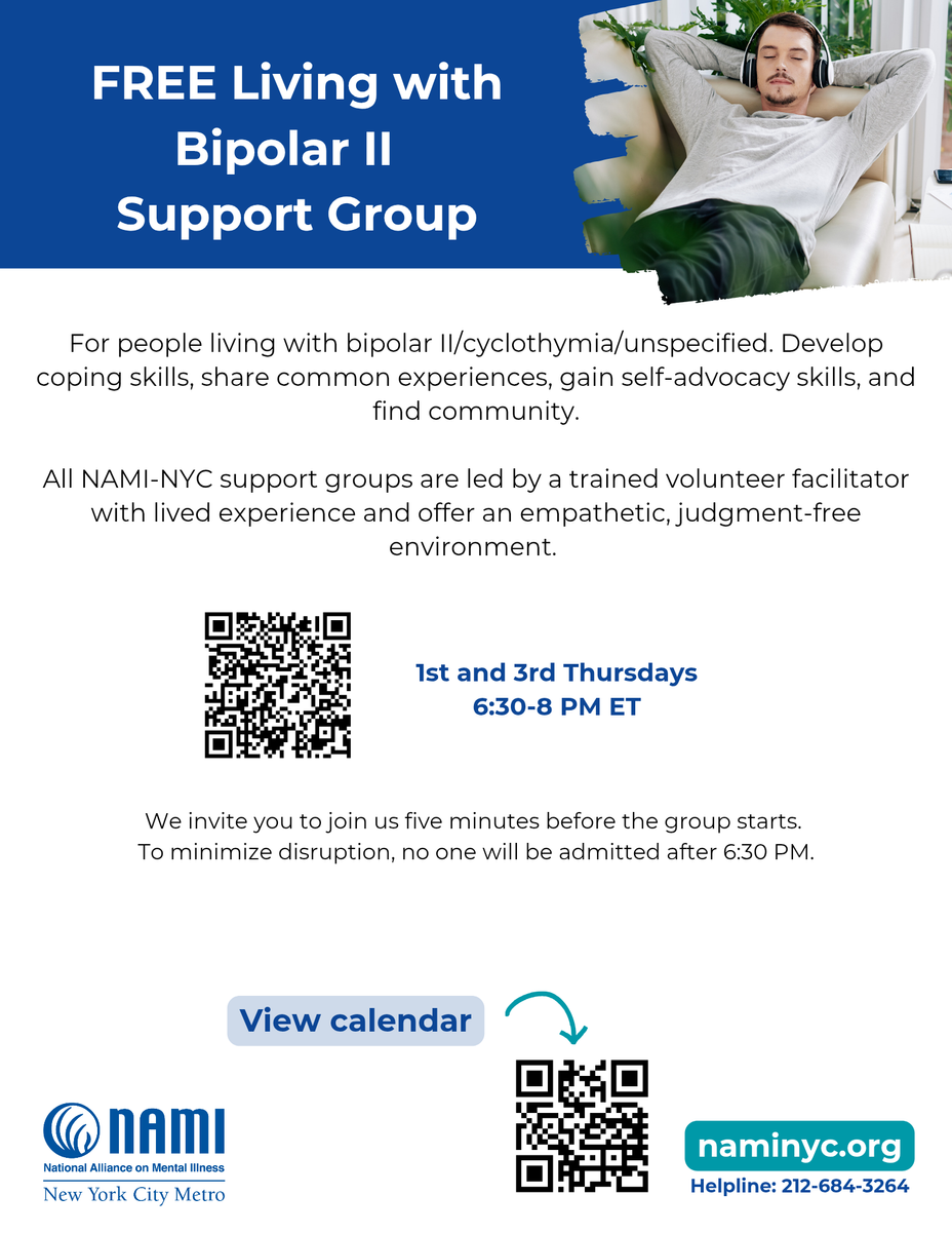Living with Bipolar II virtual support group is for people living with bipolar II/cyclothymia/unspecified. Develop coping skills, share common experiences, gain self-advocacy skills, and find community.