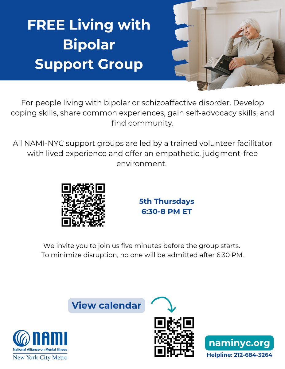 Living with Bipolar virtual support group is for people living with bipolar or schizoaffective disorder. Develop coping skills, share common experiences, gain self-advocacy skills, and find community.