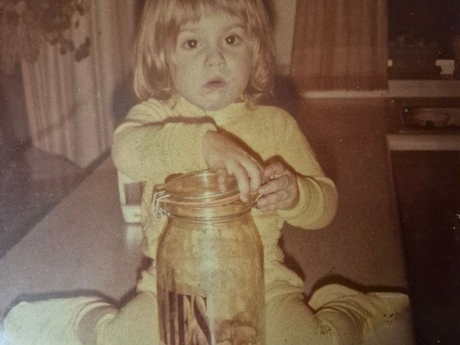 Then a chair to the cabinet, climb up and there she was, ready for a zweibach.