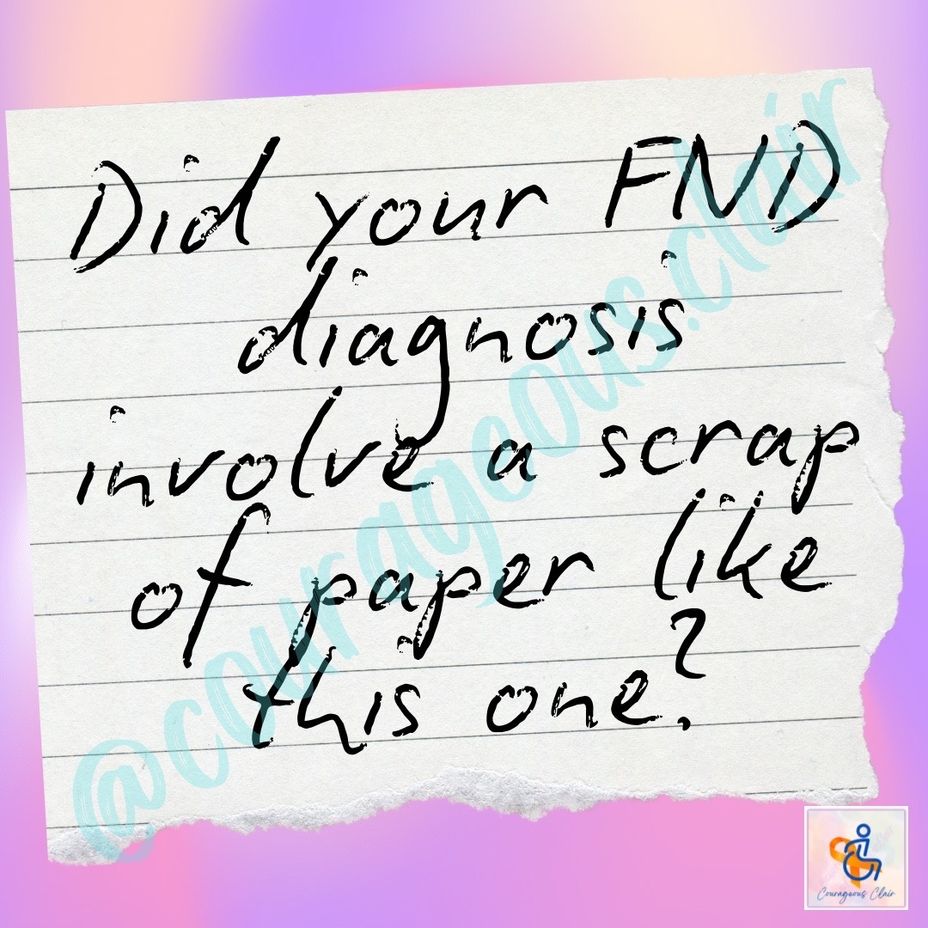 From speaking to people who live with Functional Neurological Disorder (FND), it seems that there is something that seems to be a common experience for many people – that they were given a scrap of paper with some website addresses written on it at the same time as they received their FND diagnosis. This was certainly the case for me when I was diagnosed with FND – 2 websites (one for @fndhope and the other for neurosymptoms) scribbled on a torn off piece of paper. So, I am interested to know how many other people have also experienced this when they were diagnosed with FND.