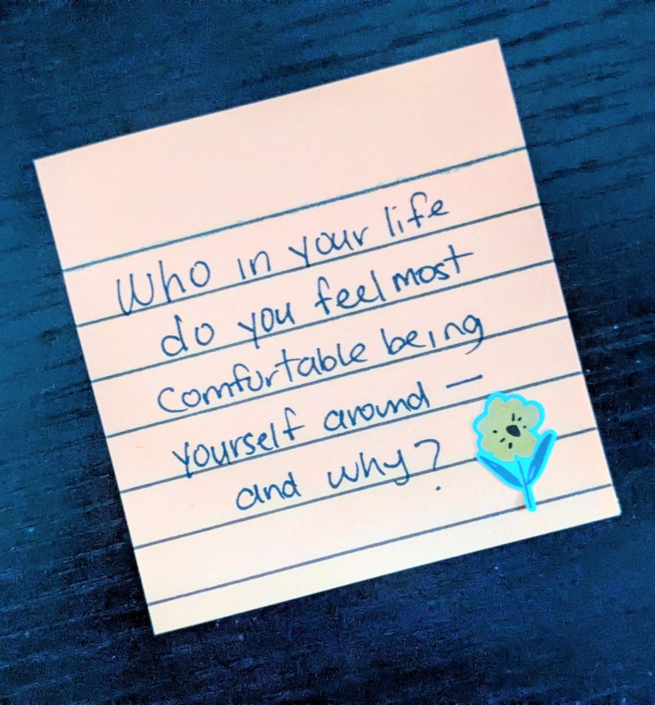 If no one comes to mind right now, that’s totally OK. Instead, feel free to share what types of spaces or circumstances help you feel comfortable. What about those environments helps you feel safe to be yourself?