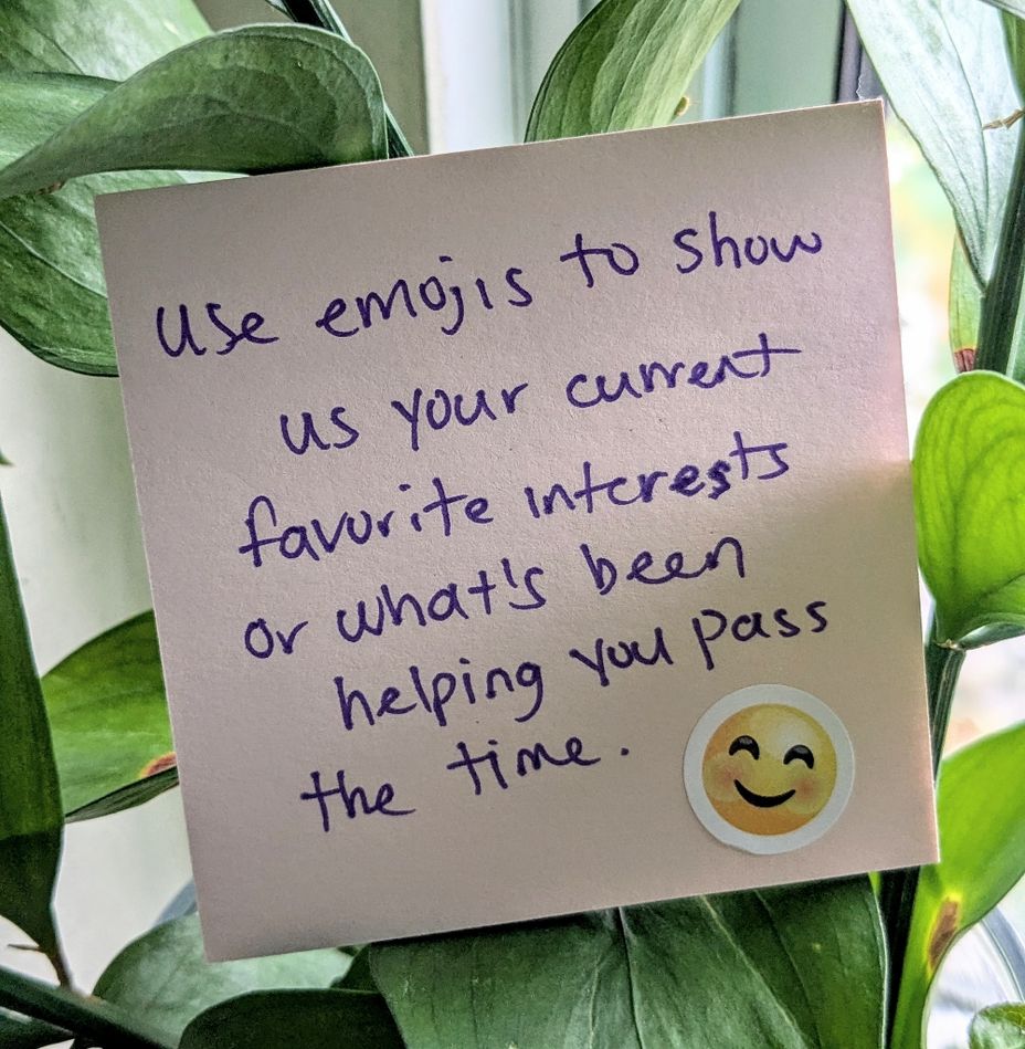 Use emojis to show us your current favorite interests or what’s been helping you pass the time.