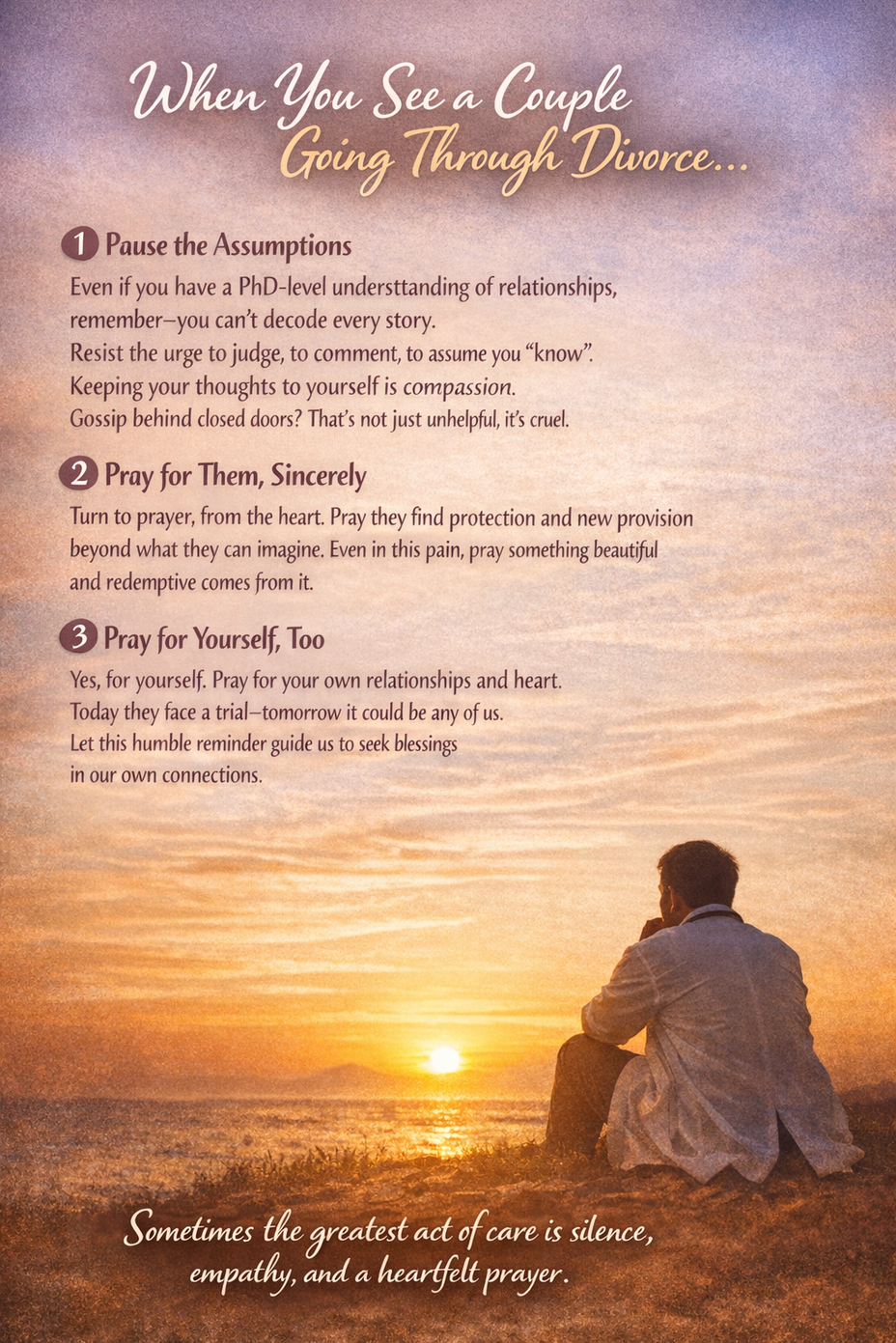 As doctors, we witness not just illnesses of the body, but also the silent, painful struggles of the heart. And when we see a couple navigating the stormy, traumatic process of divorce, there are three deeply important things we must remember: